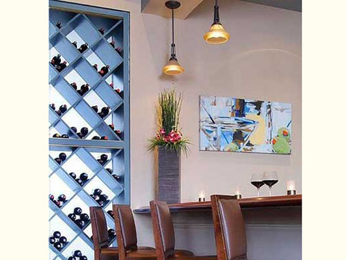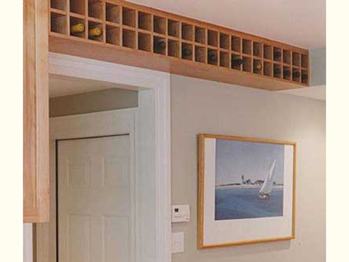 一些閑置的墻體,也可以被用來發(fā)揮用處,特別是一些原本被忽略的閑置墻體??窗咐芯椭v門框上的空間打造成壁式酒架,很好的利用了空間。