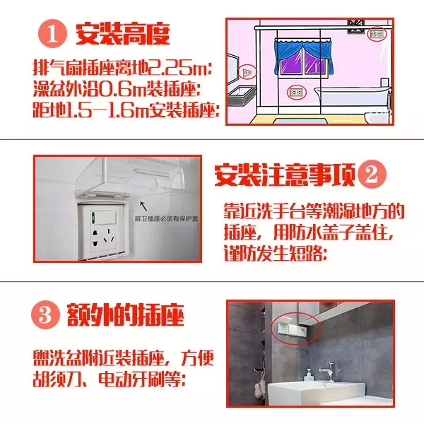 安裝在衛(wèi)生間的插座宜帶開關和指示燈,如果安裝在潮濕位置的插座,好在插座表面安裝一個防水的蓋子,避免水汽進入插座內(nèi),引起短路。