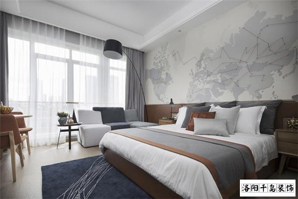 我真是沒(méi)有想到臥室能夠裝修的這么寬敞大氣,主要是格局劃分非常棒,樣板間在裝修的時(shí)候把陽(yáng)臺(tái)與臥室打通,這樣使得空間進(jìn)一步得到了擴(kuò)展,另外在背景墻上采用高級(jí)灰色的格調(diào),上面還有世界地圖的圖案,將臥室映襯的非常宏偉壯觀。