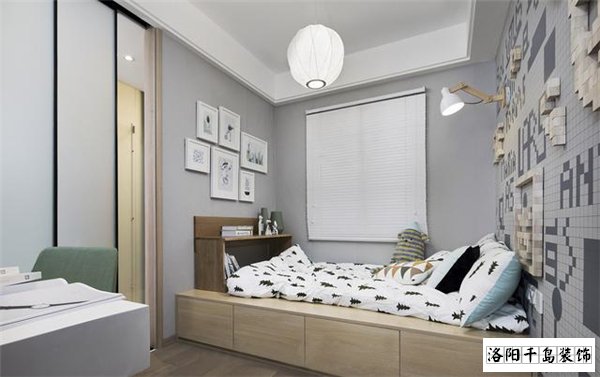 小臥室面積比較小,樣板間采用了時(shí)下很流行的榻榻米設(shè)計(jì)案例,這樣能夠?yàn)榕P室節(jié)省很多空間,使得臥室顯得更加寬敞一些,另外臥室色彩搭配也是非常棒的,采用了這種淺灰色的格調(diào),在背景墻上還做了造型的設(shè)計(jì),顯得非常年輕有活力。