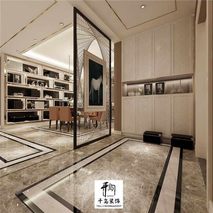 入戶玄關(guān)和餐廳之間的鏤空隔斷是整個(gè)空間的一大亮點(diǎn),非常的富有創(chuàng)意,白色的鞋柜也和整體風(fēng)格相呼應(yīng)。