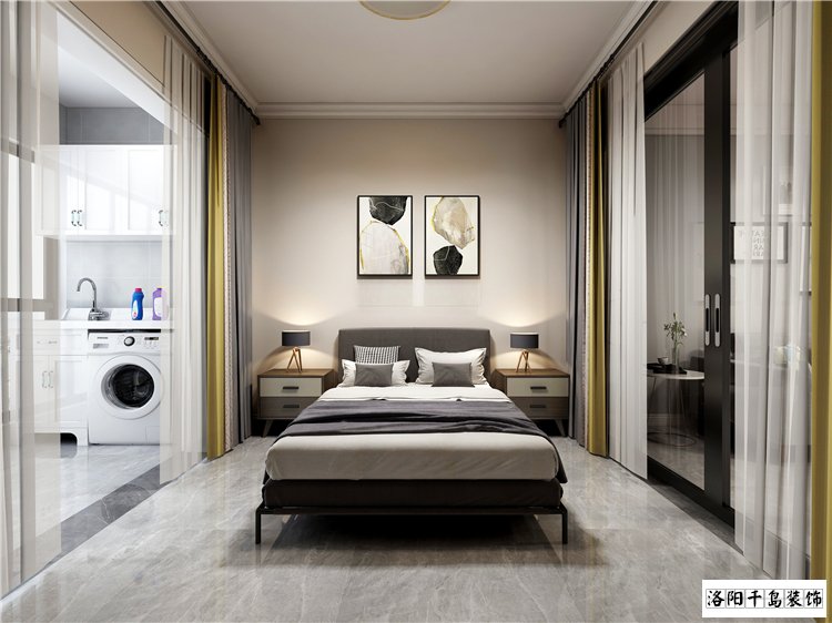 其實,客廳被“擠”出一個房間后,采光通常就會受影響,這時候我們可以通過“借光”的方式來解決,通常的做法是使用玻璃磚或者鋼化玻璃來代替隔墻,本案例就是通過透明玻璃推拉門作為空間的分割,保證采光的同時,配合窗簾也有很好的封閉私密空間。