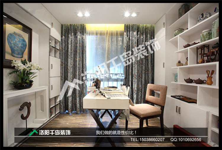 書房,是一個學習、休閑的地方,工作一整天,回到這里,讓躁動的心安靜下來,中式古典裝飾品加上現(xiàn)代化特征明顯的裝修,在這里,整個人都會得到凈化。