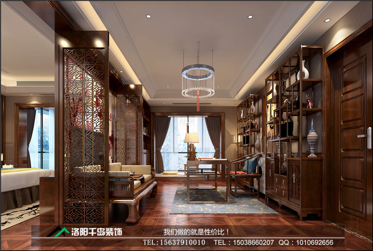 臥室就是個人休息的地方,所以在用色方面盡量穩(wěn)重而不跳躍,讓人能靜下心來,床頭的中式木花格配合荷花形狀裝飾品體現(xiàn)中式韻味。另外主臥室與書房之間鏤空花格隔斷,茶色與木色是書房的主調(diào),虛實有致的結(jié)構(gòu)讓小空間也充滿趣味。洛陽開元名郡225㎡復(fù)式新中式裝修案例@二樓臥室兼書房
