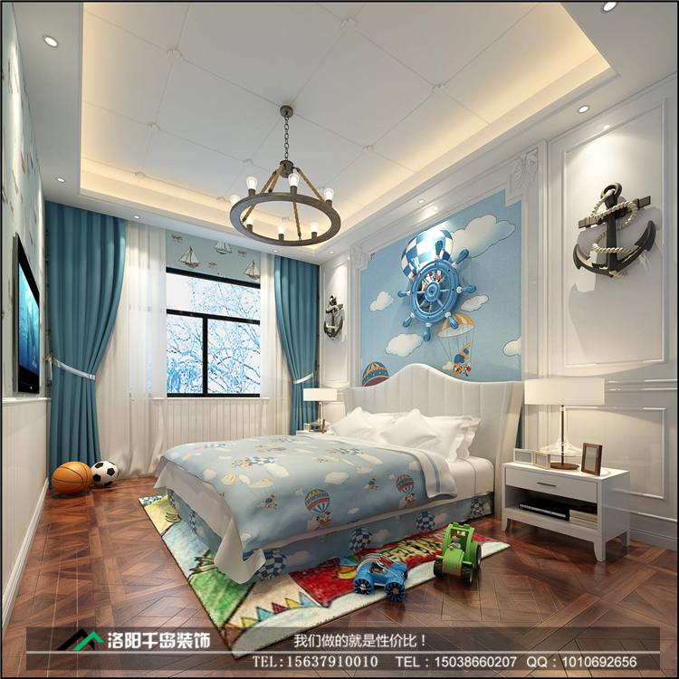 兒童房被設(shè)置在了二層。兒童房海藍色與卡通元素的點綴,讓男生的空間充滿了活躍的氣息。洛陽開元名郡225㎡復(fù)式新中式裝修案例@二樓兒童房