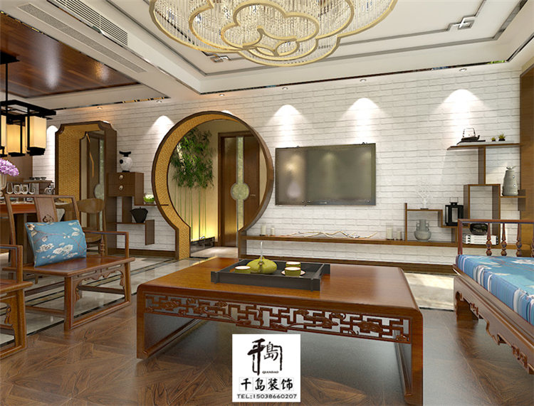 建業(yè)龍城200平米四室新中式裝修效果圖案例——客廳電視墻裝修效果圖