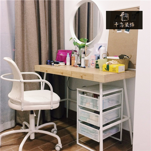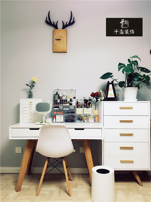 作為一個美妝愛好者,化妝區(qū)怎么可以不夠大!妝臺實際上是個書桌,配上同系列的斗柜收納各種囤貨,每天坐在這里心情都格外舒暢啊~