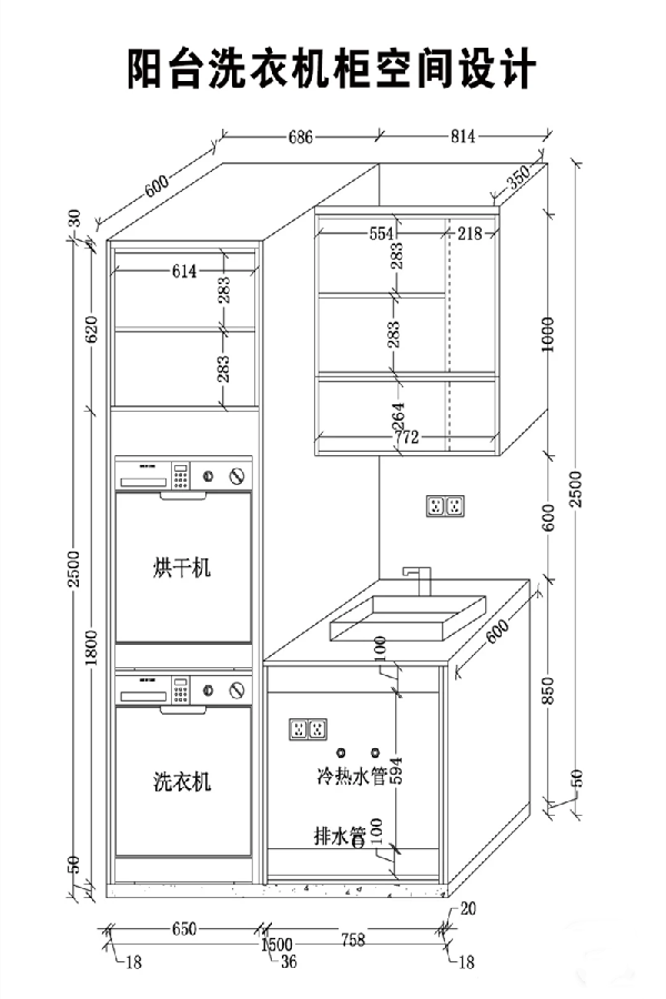 4、洗衣機(jī)柜內(nèi)空尺寸:根據(jù)洗衣機(jī)高和寬來(lái)定,提前定好洗衣機(jī)和烘干機(jī)尺寸