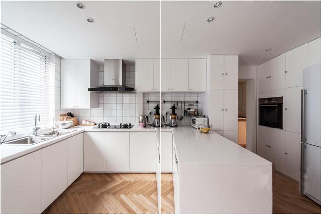 地面使用瓷磚雖然是老規(guī)矩,但是它看起來(lái)很冷硬,所以這個(gè)廚房使用小白磚加原木地板的硬裝,增加了廚房空的親切感,看起來(lái)也更舒服。