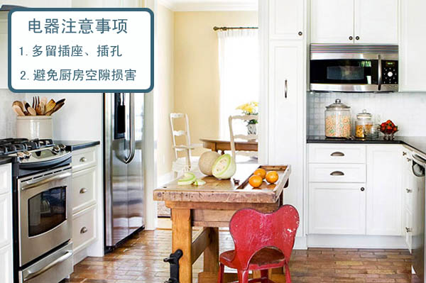 通常擺放在廚房的電器很多,冰箱、微波爐、烤箱、洗碗柜有時候也將熱水器放置在廚房中。這樣廚房的電壓就比較大,在廚房裝修注意事項中一定注意此項,裝修時應(yīng)預(yù)留多的插孔。