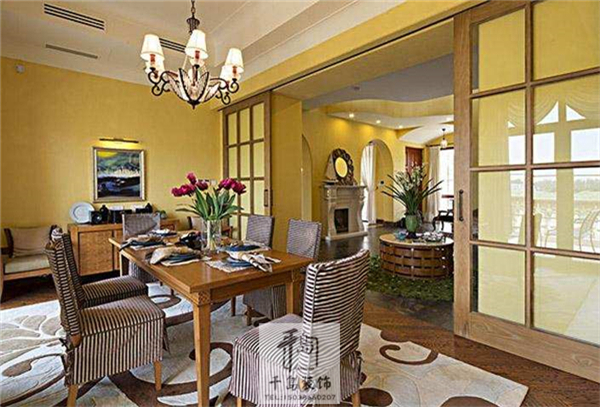 大家都知道黃色是有助于增加食欲的色彩,所以餐廳就更應該選擇一些偏黃色的色彩,帶給人暖意融融的氣氛,黑白搭配的吊燈,則能展現(xiàn)美式風情,打造餐廳的混搭風。