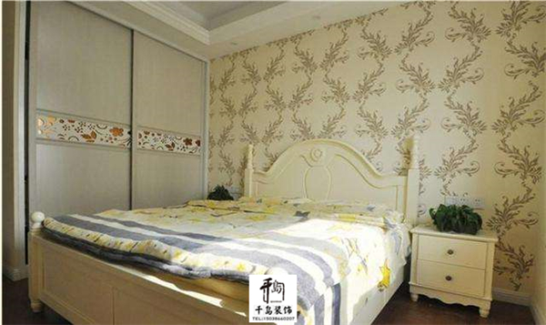 主臥以舒適為主,壁紙看起來挺溫馨的。移門衣柜比較節(jié)省空間。